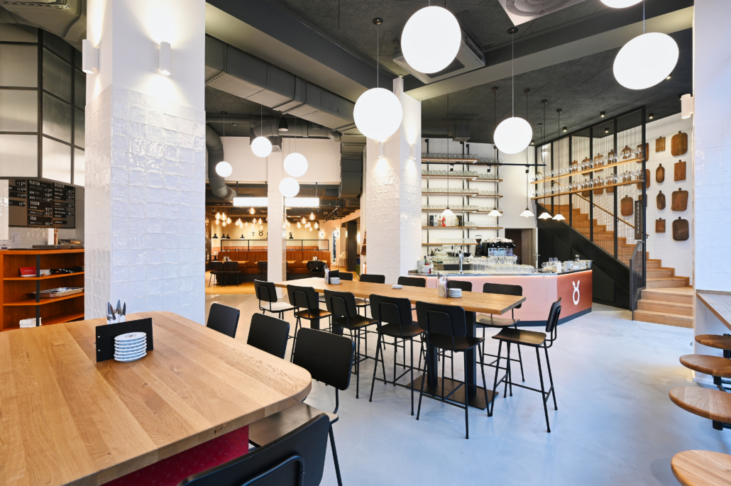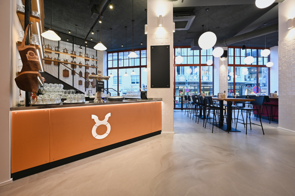 Dieser Boden ist weit mehr als eine Nutzfläche: Er ist ein Statement. Durch die fugenlose Verarbeitung schaffen wir eine weitläufige, moderne Atmosphäre, die dem Raum Ruhe verleiht. Die handwerkliche Herausforderung liegt hier im Detail. Die Oberfläche muss robust genug für den harten Gastronomie-Alltag sein, gleichzeitig aber eine haptische Tiefe besitzen, die Wärme ausstrahlt. In Kombination mit dem von uns verlegten Industrieparkett in Teilbereichen entsteht ein spannender Materialmix, der den urbanen Charakter des Restaurants unterstreicht. Präzise Übergänge und saubere Anschlüsse an die Gewerke sind dabei unsere Handschrift.