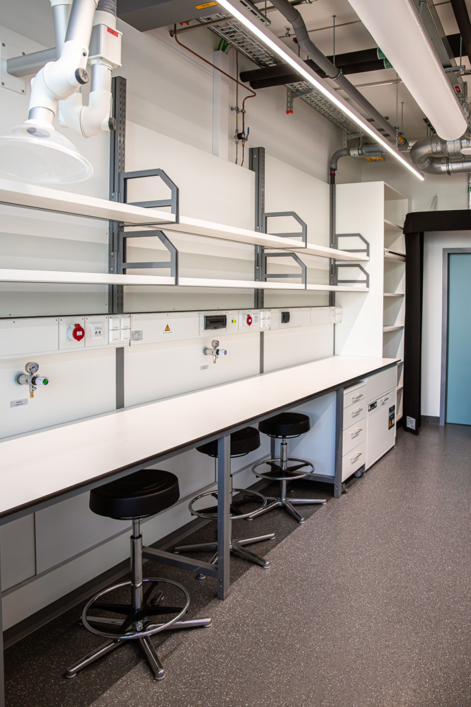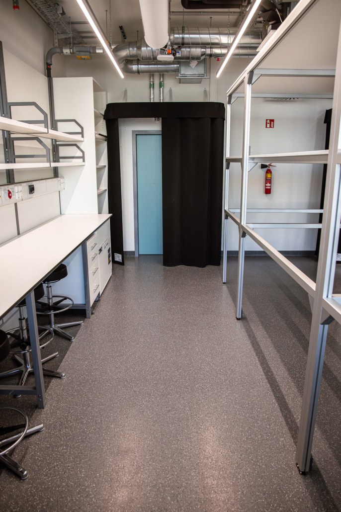 Der eingesetzte Bodenbelag ist für den anspruchsvollen Einsatz in Laborbereichen konzipiert. Er ist robust, hygienebeständig, feuerfest und erfüllt die Anforderungen an die Rutschsicherheit R9. Die elektrostatisch ableitende Ausführung gewährleistet den notwendigen ESD-Schutz für sensible elektronische Bauteile. Auch bei hoher Beanspruchung, etwa in Gabelstaplerbereichen, bleibt der Belag dauerhaft belastbar. Die Trittschalldämmung von 10 dB trägt zu einer ruhigen Arbeitsatmosphäre bei.