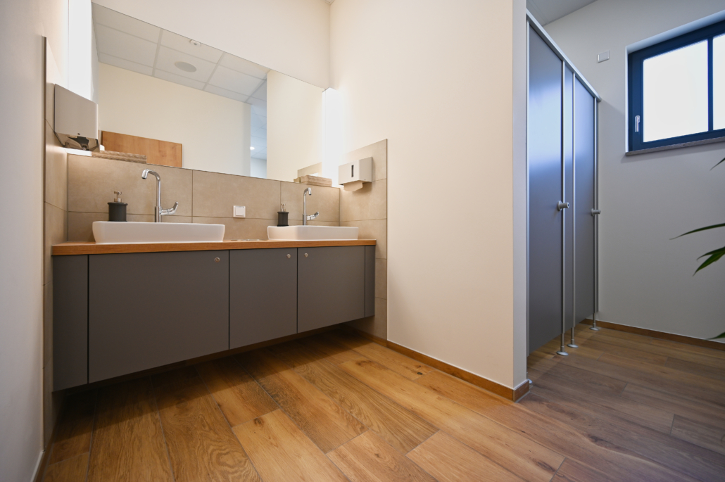 Im Kuppelgebäude kamen Verbundplatten zum Höhenausgleich zum Einsatz, und DAMIAN WERNER hat eine umfassende Abdichtung durchgeführt. Mit Steinzeugfliesen in 20×20 cm und speziellen Hohlkehlsockelfliesen wurde eine robuste und langlebige Lösung installiert.